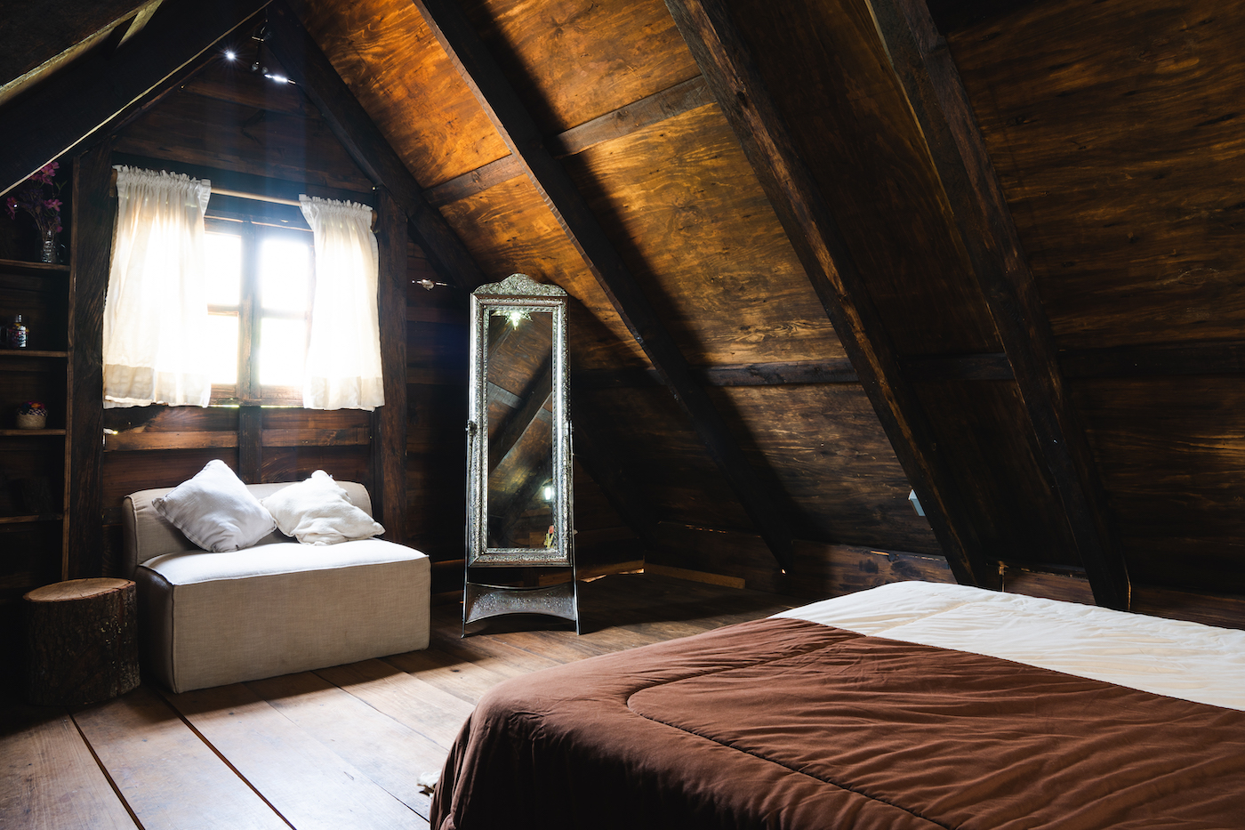 Cabaña Tecuanita es una acogedora opción para dos personas que buscan una experiencia tranquila en contacto con la naturaleza. En la planta alta cuenta con un tapanco con cama matrimonial, mientras que en la planta baja encontrarás una pequeña sala, comedor, cocineta y baño completo.